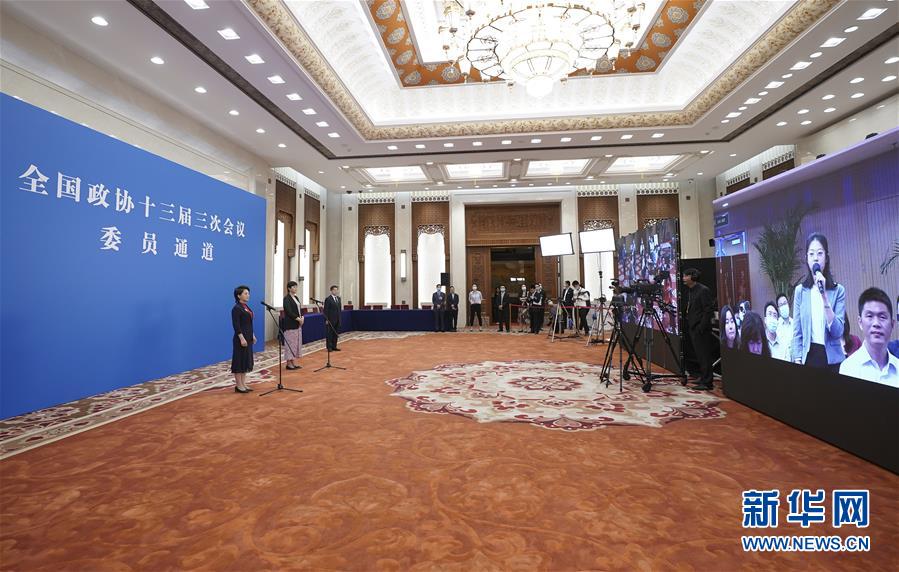 5月24日,在北京人民大會堂新聞發(fā)布廳舉行全國政協(xié)十三屆三次會議第二場“委員通道”采訪活動。這是全國政協(xié)委員通過網(wǎng)絡(luò)視頻方式接受媒體采訪。 新華社記者 劉金海 攝