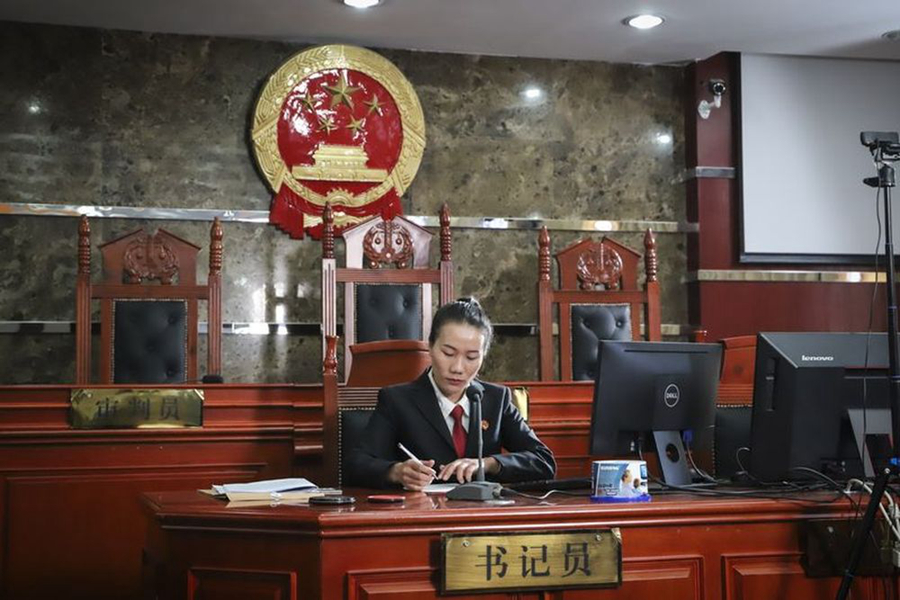 李金蓮在迪慶州中級人民法院法庭上準備開庭工作(5月7日攝)。新華社發(fā)(肖竹尹攝)