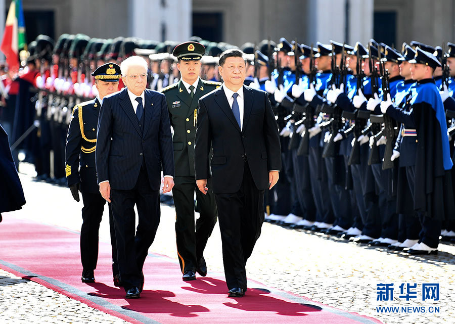 習(xí)近平和夫人彭麗媛抵達(dá)時,馬塔雷拉總統(tǒng)和女兒勞拉在停車處迎接,互致問候。隨后,軍樂團(tuán)奏中國、意大利兩國國歌,升中國國旗。兩國元首一同檢閱儀仗隊(duì)。儀仗隊(duì)長趨前請習(xí)近平檢閱。習(xí)近平在馬塔雷拉總統(tǒng)陪同下依次檢閱陸軍、海軍、空軍和騎兵方隊(duì)。習(xí)近平同意方主要官員握手,馬塔雷拉總統(tǒng)同中方陪同人員握手。