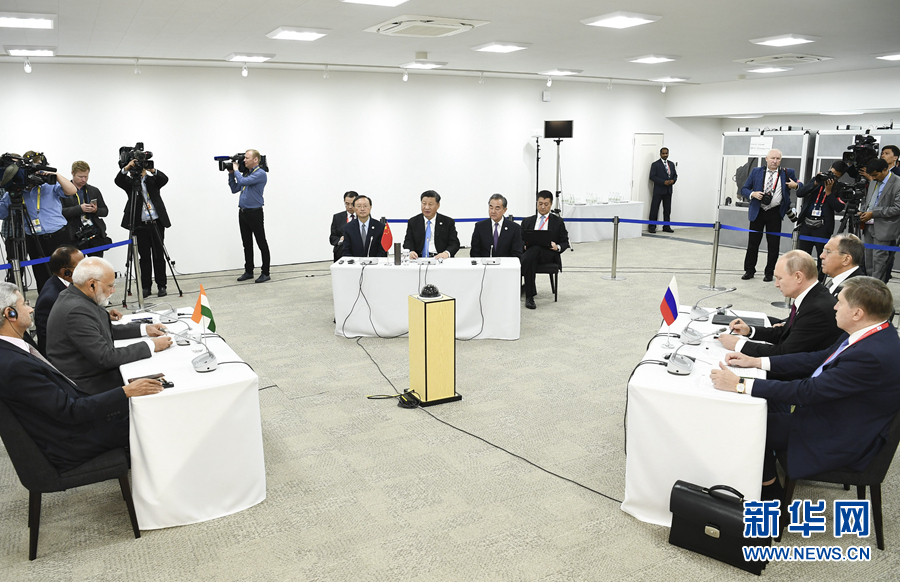 6月28日,國家主席習近平在大阪出席中俄印領(lǐng)導人會晤,同俄羅斯總統(tǒng)普京、印度總理莫迪就當前國際形勢、重大國際和地區(qū)問題、三方合作深入交換意見。 新華社記者 謝環(huán)馳 攝