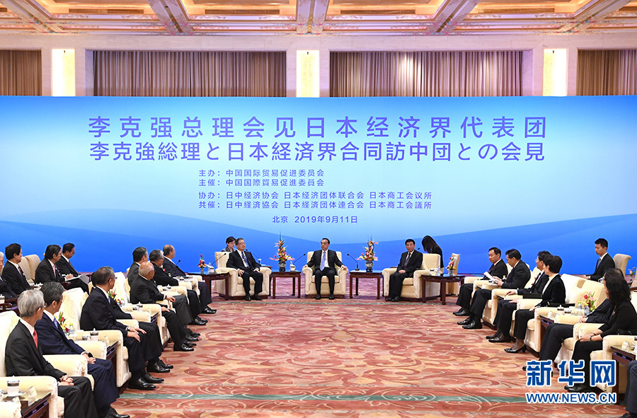9月11日,國務(wù)院總理李克強在北京釣魚臺國賓館會見日中經(jīng)濟協(xié)會會長宗岡正二、日本商工會議所會長三村明夫、日本經(jīng)濟團體聯(lián)合會審議員會議長古賀信行率領(lǐng)的日本經(jīng)濟界代表團并同他們座談交流。 新華社記者 饒愛民 攝