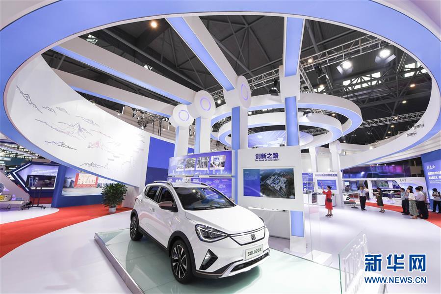 在2018世界制造業(yè)大會上,江淮大眾汽車有限公司推出的首款車型SOL(思皓)E20X亮相(2018年5月25日攝)。 新華社記者 張端 攝