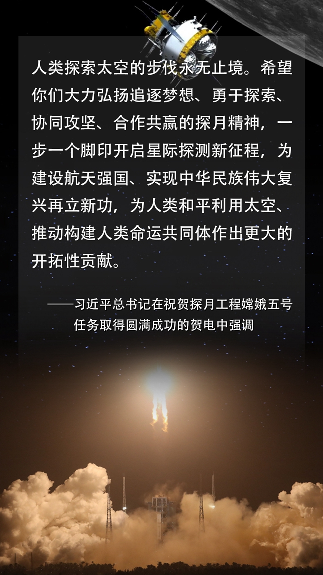 偉大精神燭照奮進征程。探索浩瀚宇宙,是中華民族不懈追求的偉大夢想。嫦娥五號任務的圓滿成功,以及在探月實踐中形成的寶貴精神財富,激蕩起我們科技自立自強的信心與力量,激勵著中國航天人繼續(xù)勇攀高峰。追夢沒有坦途,圓夢唯有實干。我們要牢記總書記重要囑托,大力弘揚探月精神,開啟星際探測新征程,向更加璀璨的星空邁出更堅定的中國步伐,為建設航天強國、實現中華民族偉大復興的中國夢,為人類和平利用太空、推動構建人類命運共同體作出更大的貢獻。