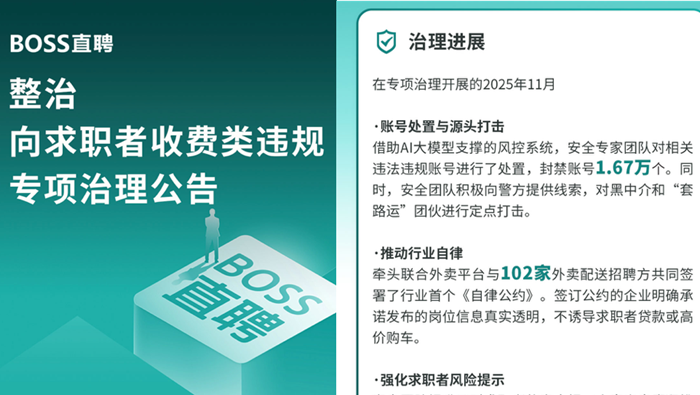 BOSS直聘:單月封禁1.67萬涉“套路收費”類賬號,推送400萬次風(fēng)險提示