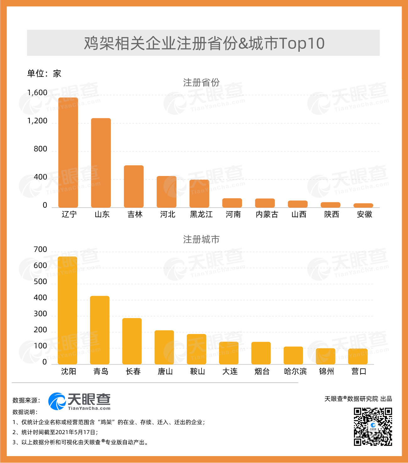 ????? 從地域分布上看,遼寧的雞架相關(guān)企業(yè)數(shù)量最多,有近1,600家,占全國近3成。其次為山東,有1,200余家雞架相關(guān)企業(yè)。分城市來看,沈陽以670余家雞架相關(guān)企業(yè)位居全國首位,其次為青島,有400余家相關(guān)企業(yè)。天眼查數(shù)據(jù)顯示,近年來我國雞架相關(guān)企業(yè)年注冊(cè)量整體呈現(xiàn)上漲趨勢。2019年,我國新增2,200余家雞架相關(guān)企業(yè),年注冊(cè)量達(dá)到歷史最高。2020年,我國新增近2,000家雞架相關(guān)企業(yè)。