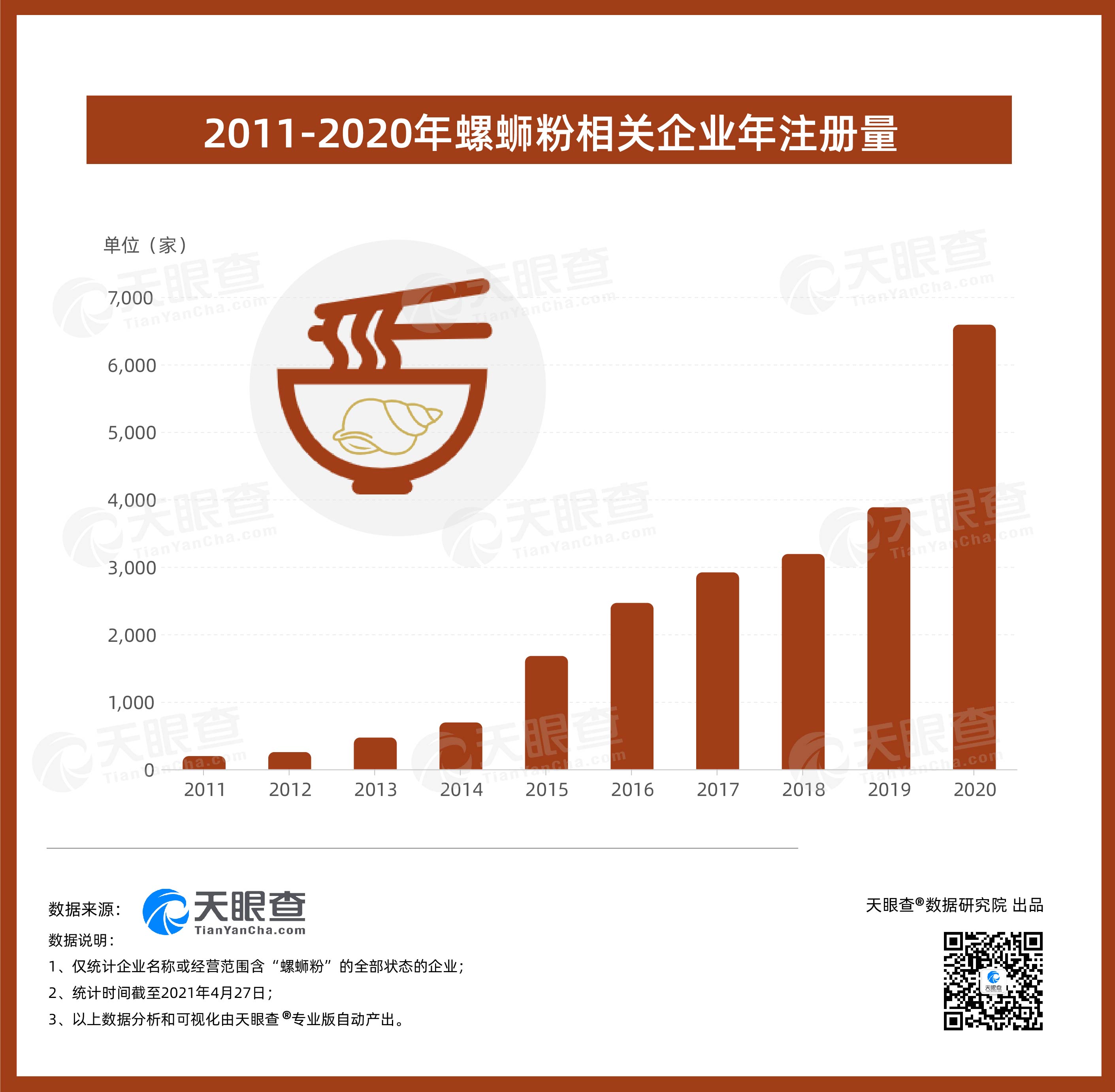????? 這碗起源于20世紀(jì)七八十年代夜市的地方小吃,如今是柳州最亮眼的新名片之一。從2014年底第一家袋裝螺螄粉企業(yè)誕生,到2020年產(chǎn)值超百億元,僅僅用了6年時(shí)間。袋裝螺螄粉如今遠(yuǎn)銷海外20多個(gè)國家和地區(qū),約25萬個(gè)就業(yè)崗位遍布在全產(chǎn)業(yè)鏈各個(gè)環(huán)節(jié)。天眼查數(shù)據(jù)顯示,我國目前有超1.8萬家企業(yè)名稱或經(jīng)營范圍含“螺螄粉”,且狀態(tài)為在業(yè)、存續(xù)、遷入、遷出的螺螄粉相關(guān)企業(yè)。其中,近9成的相關(guān)企業(yè)注冊(cè)時(shí)間在5年之內(nèi)。