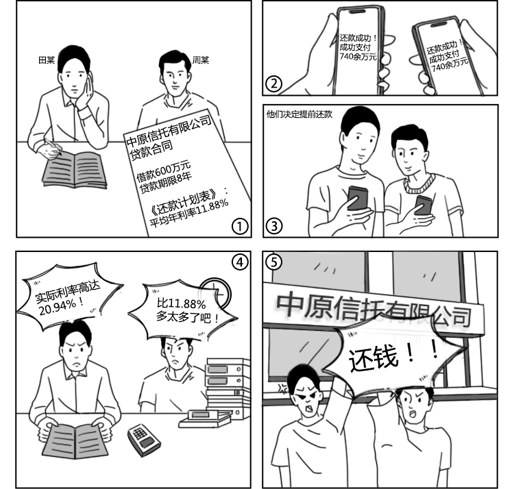 根據(jù)合同約定,田某、周某按期歸還了15期本息。隨后,田某、周某提前還款,實際支付本息740余萬元。田某、周某認為實際利率高達20.94%,遠高于合同約定的11.88%,且中原信托在借款合同履行過程中從未披露過實際利率,遂向法院提起訴訟,要求中原信托退還多收的利息88萬余元以及占用該資金的利息損失。