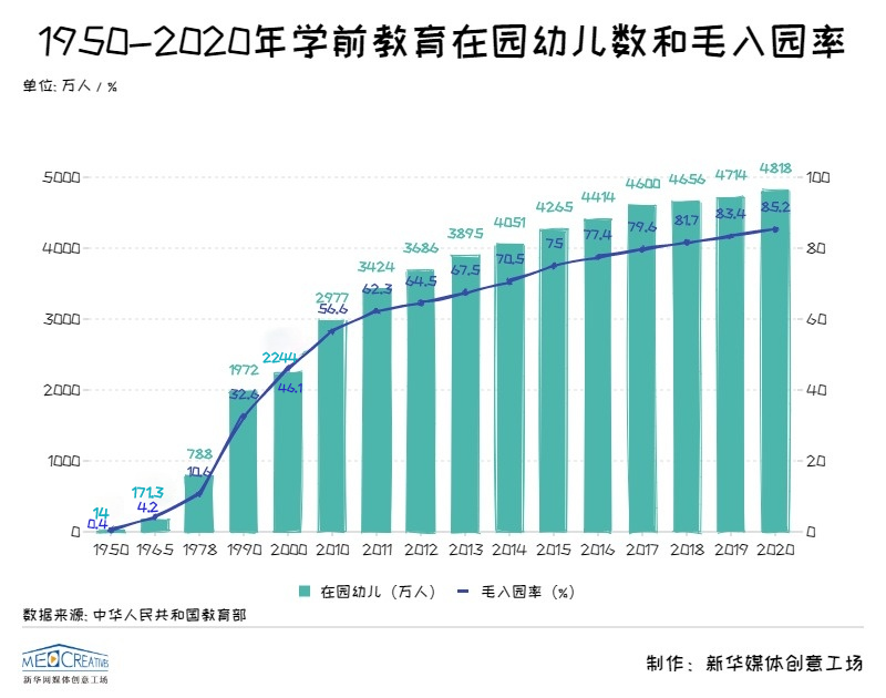 新中國成立以來,我國學(xué)前教育實現(xiàn)了快速發(fā)展。1950年我國學(xué)前教育在園兒童人數(shù)僅為14萬人,這個數(shù)字在2020年達(dá)到4818萬,學(xué)前教育毛入園率更是從1950年0.4%提高到2020年的85.2%。