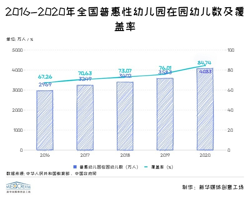 普惠性幼兒園覆蓋率逐年攀升,2020年中國普惠性幼兒園覆蓋率達(dá)84.74%,比2016年增加17.5個百分點(2016年開始統(tǒng)計普惠性幼兒園覆蓋率) ,超額完成《中共中央國務(wù)院關(guān)于學(xué)前教育深化改革規(guī)范發(fā)展的若干意見(2018年11月7日)》(后簡稱《意見》)中“到2020年,普惠性幼兒園覆蓋率(公辦園和普惠性民辦園在園幼兒占比)達(dá)到80%”的目標(biāo)任務(wù)。