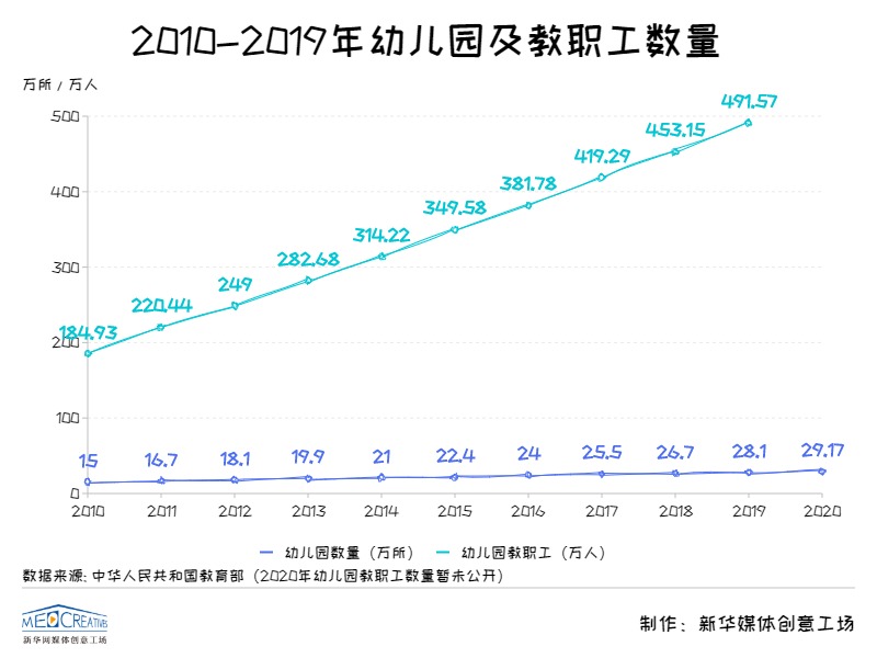 2020年,全國幼兒園總數(shù)達(dá)到29.17萬所,與2010年相比幾乎翻了一倍。于此同時,我國幼兒教師也逐漸增多,學(xué)歷層次逐年提高。2019年我國幼兒園教職工491.57萬人,比上年增加38.42萬人,增長8.48%。根據(jù)教育部最新數(shù)據(jù)顯示,2019年全國306.68萬幼兒園園長和專任教師中,本科及以上學(xué)歷的比例為25.75%,專科學(xué)歷的比例為57.83%,合計為83.58%。