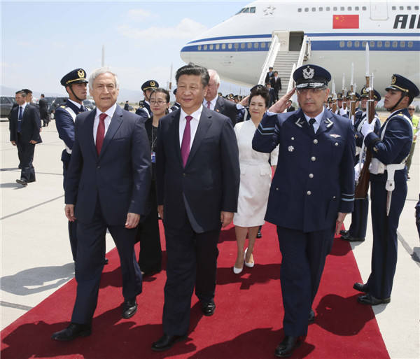 11月22日,國家主席習(xí)近平抵達(dá)圣地亞哥,對智利共和國進(jìn)行國事訪問。智利外長穆尼奧斯等在機場迎接習(xí)近平和夫人彭麗媛。(新華社記者 蘭紅光 攝)