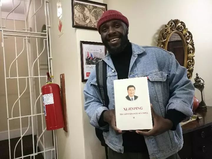 2018年7月20日,南非約翰內(nèi)斯堡大學(xué)孔子學(xué)院,學(xué)院職員邦加恩向記者展示剛從圖書室借到的《習近平談治國理政》(第二卷)英文版。(新華社記者劉衛(wèi)兵攝)