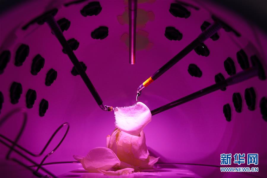 11月8日,在進博會醫(yī)療器械及醫(yī)藥保健展區(qū),達芬奇Xi手術系統(tǒng)在演示切割花瓣。新華社記者 劉大偉 攝