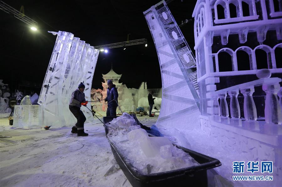 12月20日,在俄羅斯圣彼得堡市彼得保羅要塞,工人加緊布置冰雕作品。