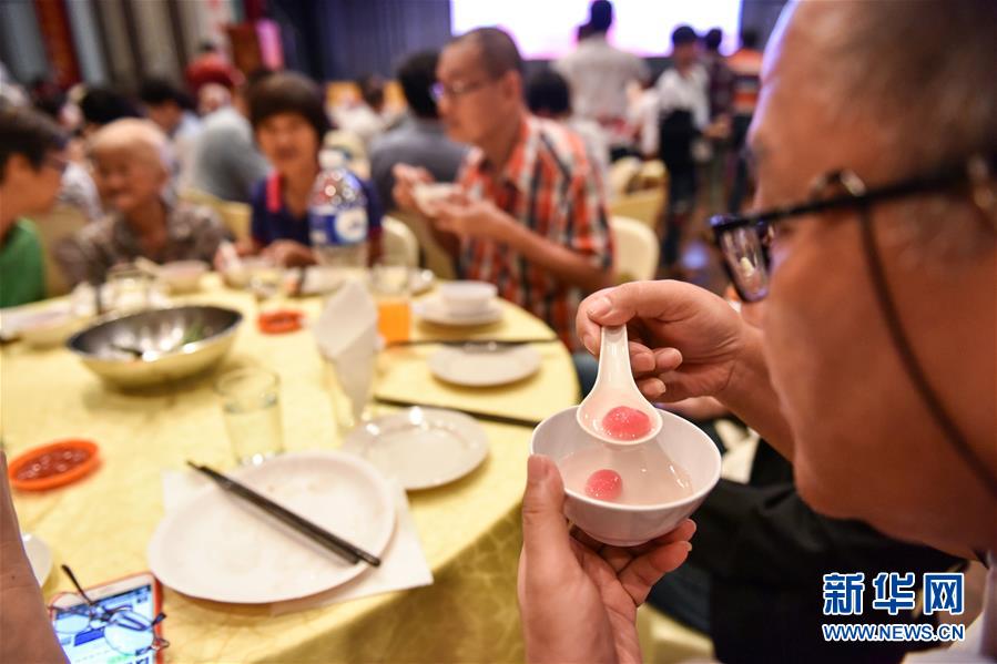 12月21日,在馬來西亞吉隆坡,人們在宴會上品嘗湯圓。 當日,馬來西亞當?shù)厝A人為迎接冬至到來舉辦“2018四季中華—溫馨冬至”活動。 新華社發(fā)(張紋綜攝)