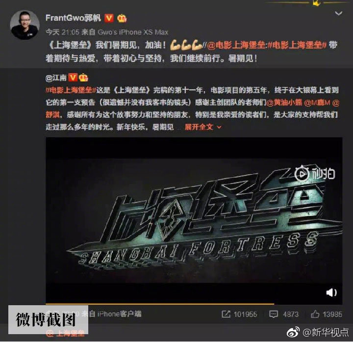 郭帆日前就在微博上轉(zhuǎn)發(fā)了科幻電影《上海堡壘》首個宣傳片,并表達(dá)對影片的期待。此片也是由《流浪地球》聯(lián)合出品方之一的騰訊影業(yè)參與出品,預(yù)計將于今年暑期上映。這種“抱團(tuán)取暖”的作法也讓不少科幻迷在網(wǎng)上津津樂道。