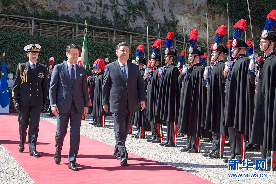 習(xí)近平抵達(dá)時(shí),孔特總理在停車處迎接。軍樂(lè)團(tuán)奏中意兩國(guó)國(guó)歌。兩國(guó)領(lǐng)導(dǎo)人一同檢閱儀仗隊(duì)。