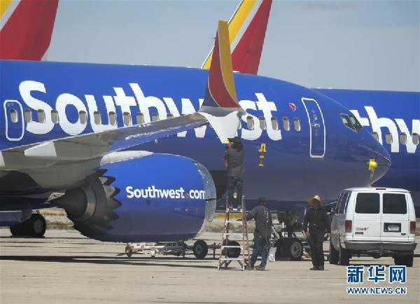 3月27日,在位于美國加利福尼亞州維克托維爾的南加利福尼亞物流機(jī)場,工作人員檢查美國西南航空公司的波音737 MAX 8型號飛機(jī)。美國波音公司27日發(fā)布公告,介紹了737MAX系列飛機(jī)軟件更新情況和對飛行員培訓(xùn)的新內(nèi)容。 新華社發(fā)(趙漢榮攝)
