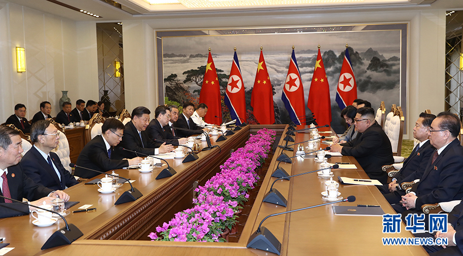 20日下午,錦繡山迎賓館1號(hào)樓會(huì)談廳。習(xí)近平總書(shū)記同金正恩委員長(zhǎng)進(jìn)行了長(zhǎng)達(dá)100分鐘的會(huì)談,就半島問(wèn)題進(jìn)行了溝通。