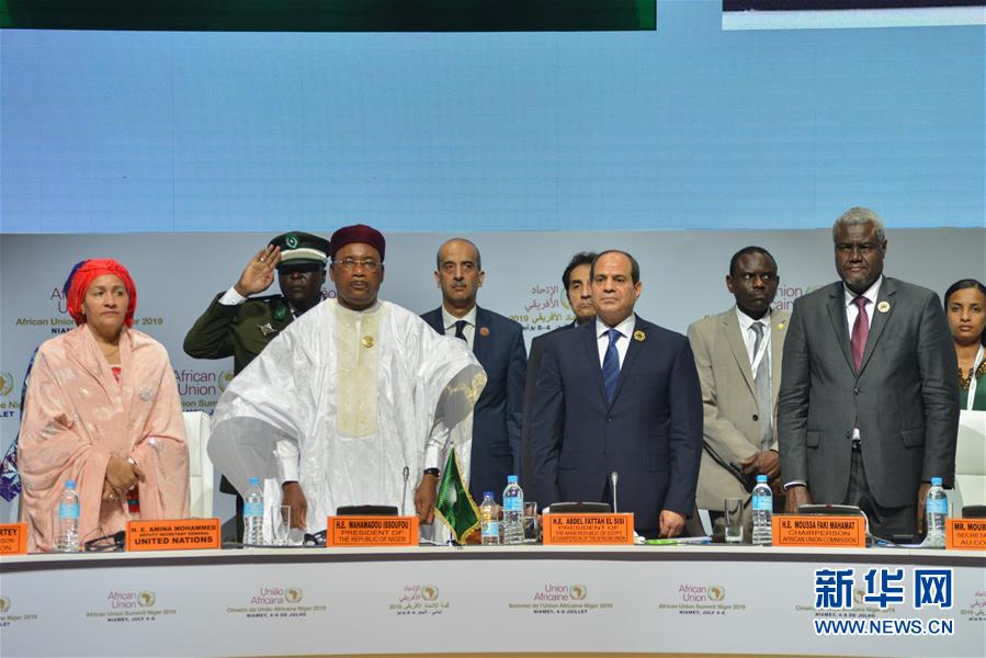 7月7日,在尼日爾首都尼亞美,非盟輪值主席、埃及總統(tǒng)塞西(前排右二)、非盟委員會主席法基(前排右一)、尼日爾總統(tǒng)伊素福(前排左二)與聯(lián)合國常務(wù)副秘書長阿明娜·穆罕默德(前排左一)出席非洲聯(lián)盟非洲大陸自由貿(mào)易區(qū)特別峰會。新華社發(fā)