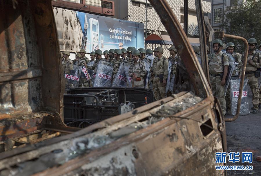 2月26日,在印度首都新德里,準(zhǔn)軍事人員聚集在被燒毀的車輛旁警戒。新華社發(fā)(賈韋德·達(dá)爾 攝)