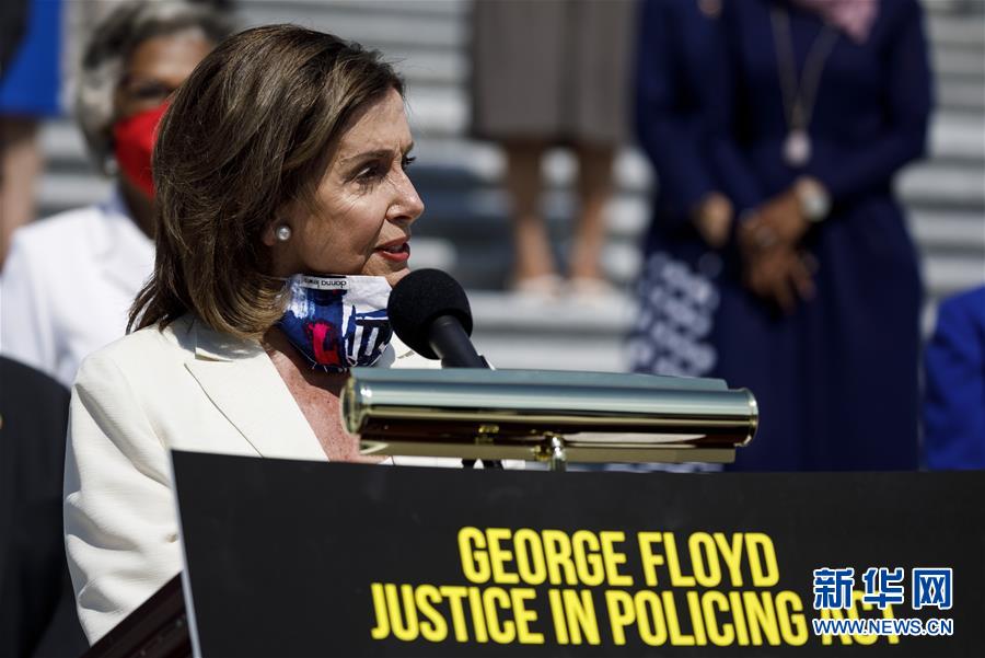6月25日,美國國會眾議院議長、民主黨人南希·佩洛西(中)在華盛頓國會山舉行的新聞發(fā)布會上講話。 美國國會眾議院25日表決通過由民主黨人提出的警務(wù)改革草案。草案內(nèi)容包括禁止警察使用鎖喉、要求執(zhí)法部門匯報使用武力情況、使執(zhí)法不當(dāng)警察更容易被問責(zé)等。 新華社發(fā)(沈霆攝)