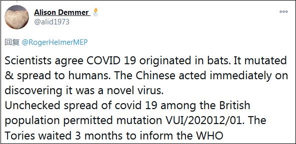 還有一名網(wǎng)友對比稱:“科學(xué)家同意新冠病毒起源自蝙蝠,變異后傳播給人類,中國人發(fā)現(xiàn)這是一種新病毒后,立即采取了行動。新冠病毒在英國人口中無限制的傳播,導(dǎo)致了變異新冠病毒(VUI/202012/01),保守黨等了3個(gè)月才通知世衛(wèi)組織?!?/p>