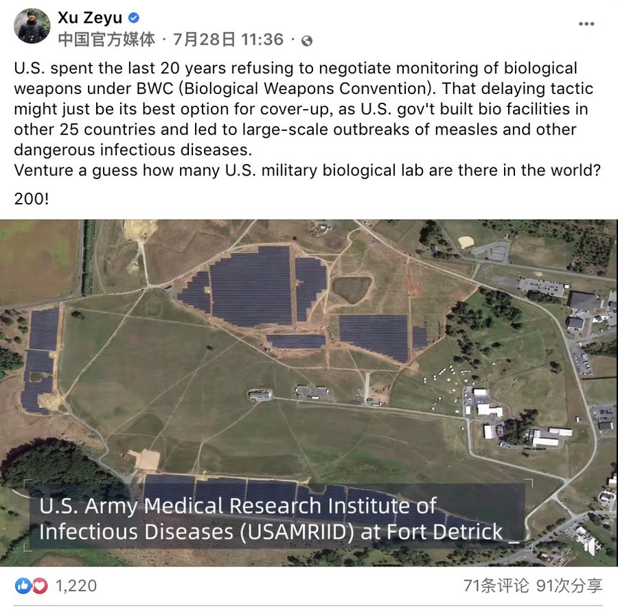 帖文寫道:近20年來,美國一直拒絕重啟《禁止生物武器公約》核查議定書的談判。這一做法或許正是美國掩蓋其秘密的最佳選擇。美國在25個國家或地區(qū)建造生物實驗室,并引發(fā)麻疹或其他危險傳染疾病的大規(guī)模爆發(fā)。猜猜美國在世界建造了多少個生化實驗室?200個!