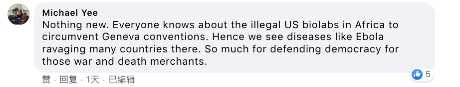 有的網友則絲毫不奇怪,表示這是美國的“常規(guī)操作”。一名叫Michael Yee的網友表示,美國為了規(guī)避國際公約,在非洲設有多個非法的生物實驗室。